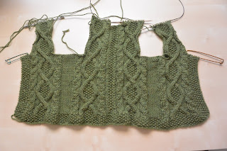 I feel like I'm not making any progress on my knitting lately.  I seem to be knitting everything at least twice.  This is a sweater for my nephew.  It's going to be a Christmas gift.  I knitted almost the entire body in the car on the way to and from our vacation in August ... and I'm going to rip it all out to start over.  August was way too soon to start a Christmas gift for an infant.  This is way too small.  I'm going to start over with the next size (or maybe two sizes) up.